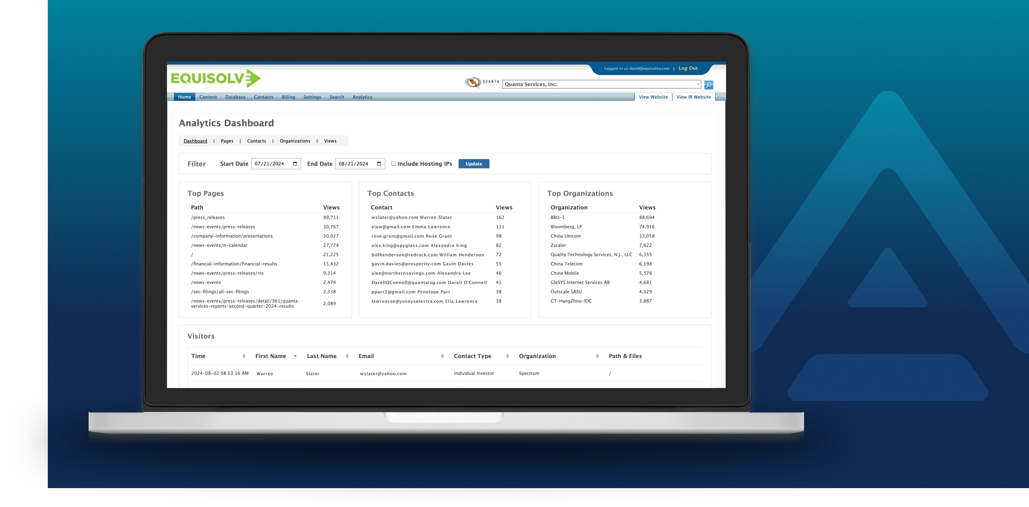 Equisolve's Analytics provides you with in-depth insight into who is visiting your IR website including company, location, user paths, referral sources, and viewed pages.